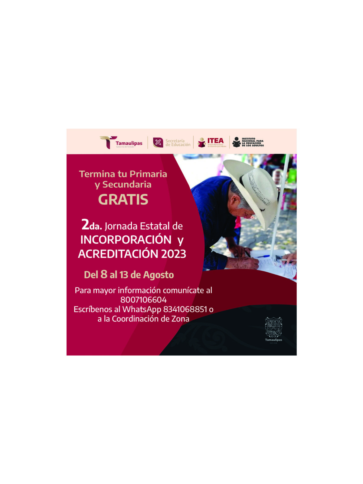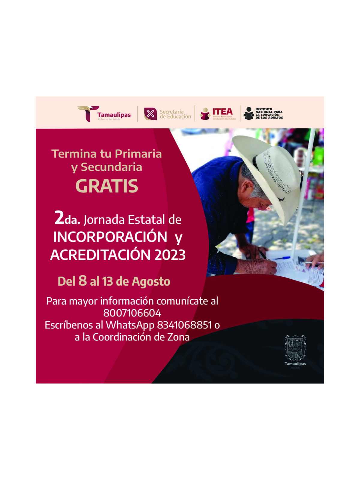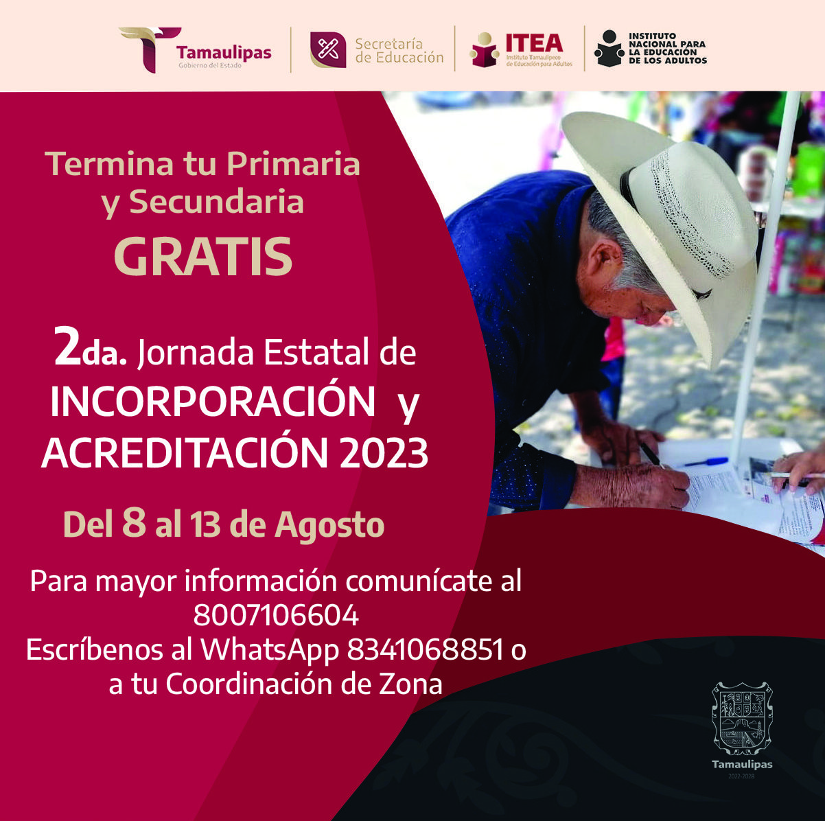 Con la finalidad de reforzar la operación de los procesos fundamentales de atención, acreditación y conclusión de educación básica a personas jóvenes y adultas en rezago educativo, el Instituto Tamaulipeco de Educación para Adultos (ITEA), invita a la Segunda Jornada Estatal de Incorporación y Acreditación 2023.