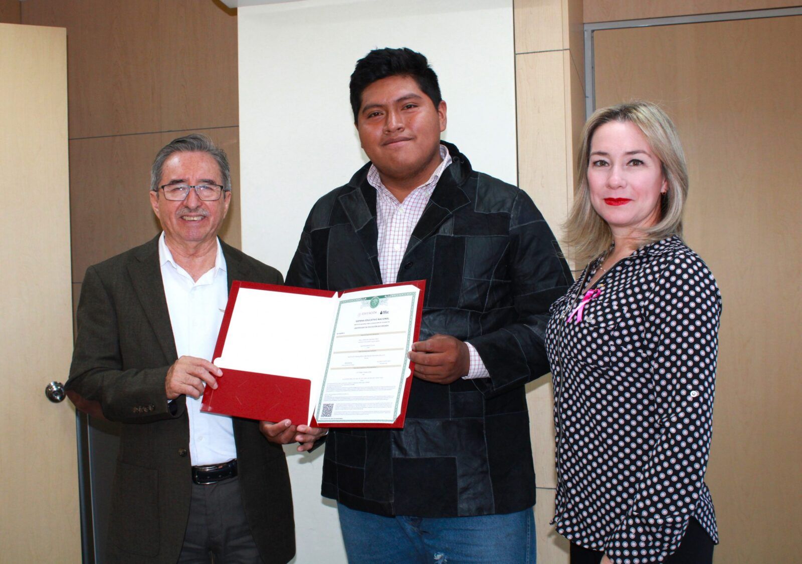 El joven Raúl Darushy Salinas Cruz, originario de Papantla Veracruz, actualmente radica en Ciudad Victoria, Tamaulipas; tiene 22 años, acudió a las oficinas del Instituto Tamaulipeco de Educación para Adultos (ITEA) a pedir información para concluir sus estudios de secundaria, presentó examen de reconocimientos de saberes y lo acreditó, por lo que este 16 de octubre, recibió su certificado y como invitado de honor del Subsecretario de Educación Media Superior y Superior, Guadalupe Acosta Villarreal, quien lo recibió en la sala de juntas de la Subsecretaría, acompañado de la directora general del ITEA, Gloria Guadalupe González González y la Directora de Operación del ITEA, Alma Georgina Barrón Torres.