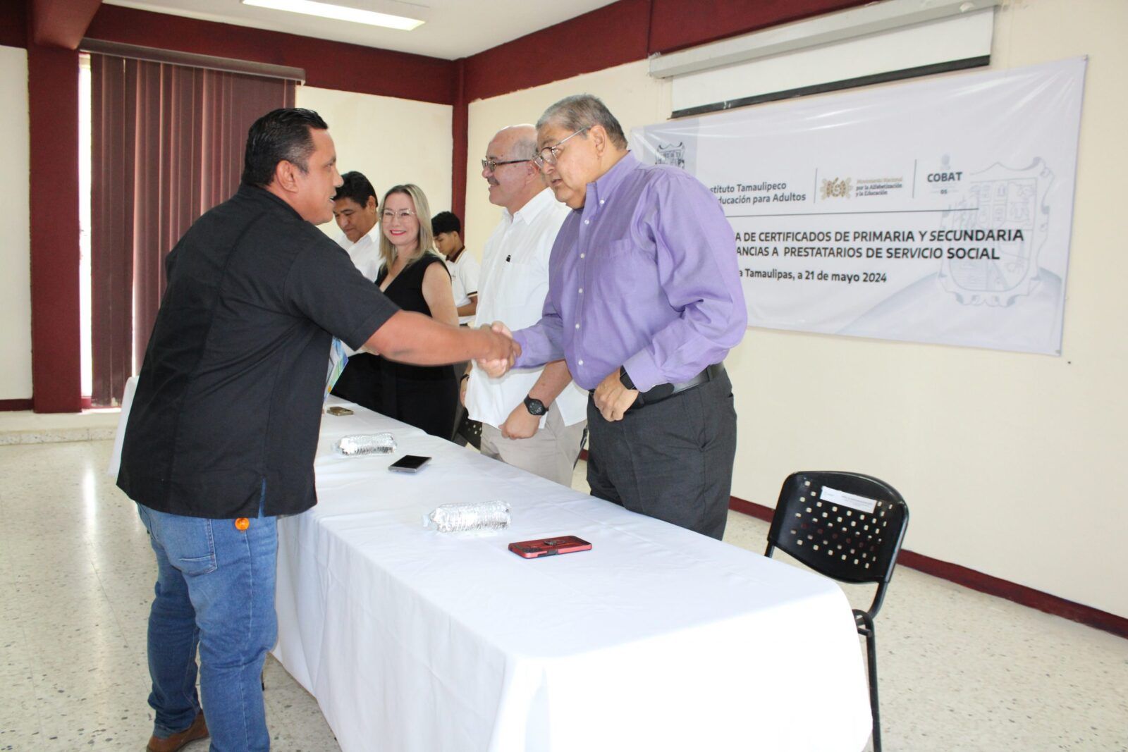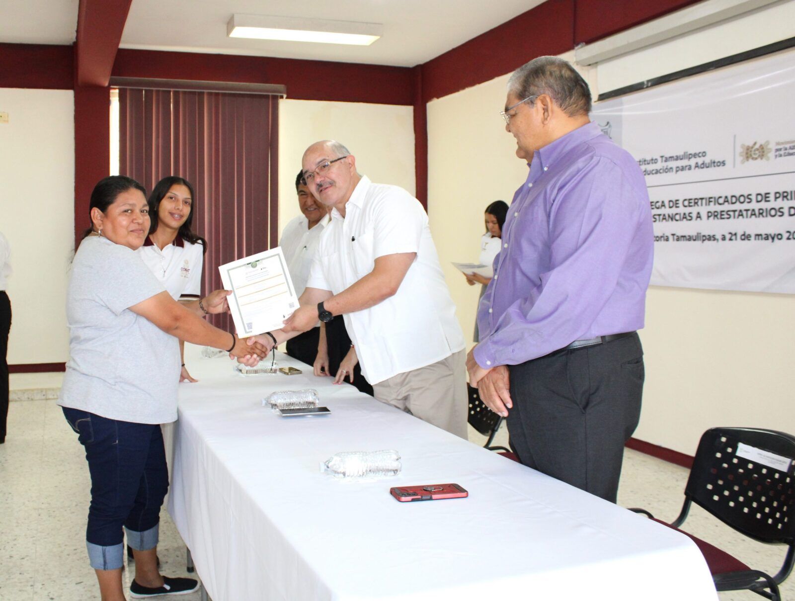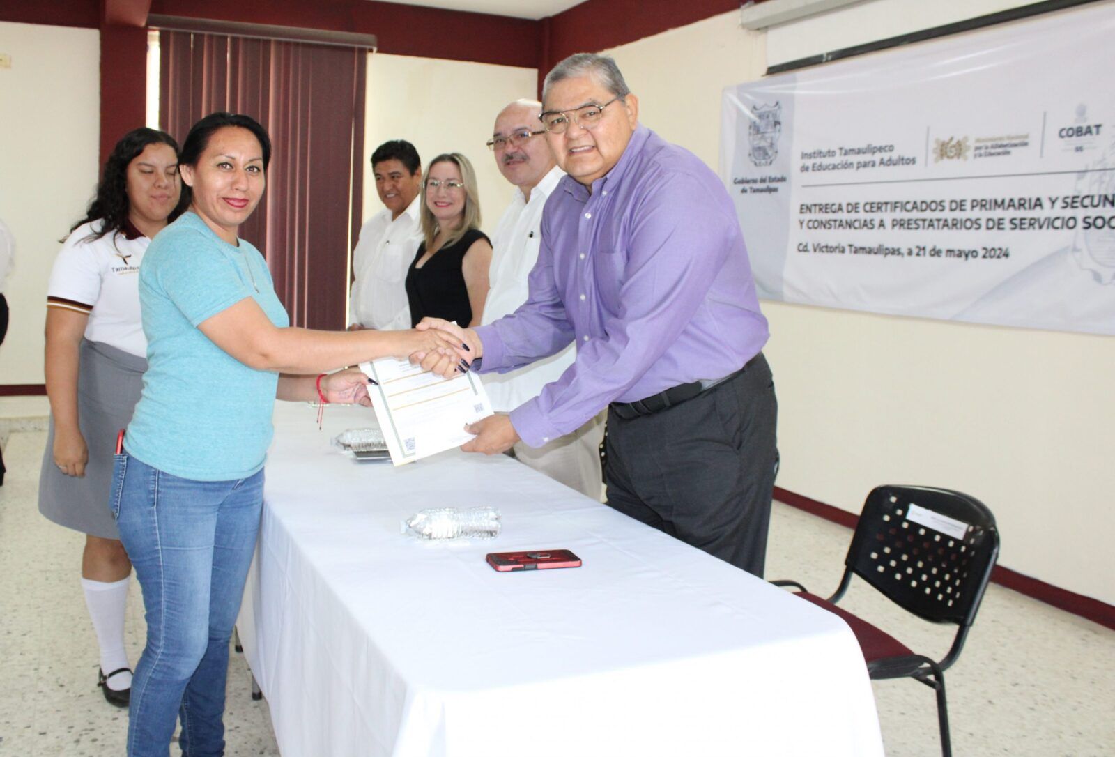 En el marco del Movimiento Nacional por la Alfabetización y la Educación (MONAE), el pasado 21 de mayo de 2024, el Instituto Tamaulipeco de Educación para Adultos hizo entrega siete certificados de Primaria y cuatro certificados de Secundaria; así como nueve constancias a prestatarios de servicio social, estudiantes del Colegio de Bachilleres del Estado de Tamaulipas (COBAT) Plantel 05 de Ciudad Victoria.
