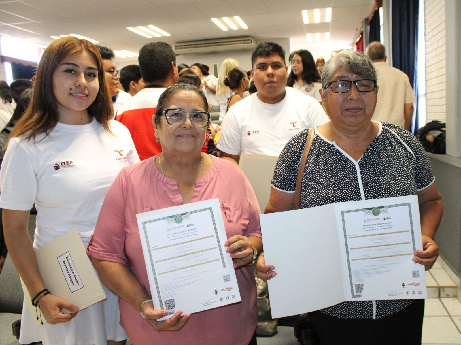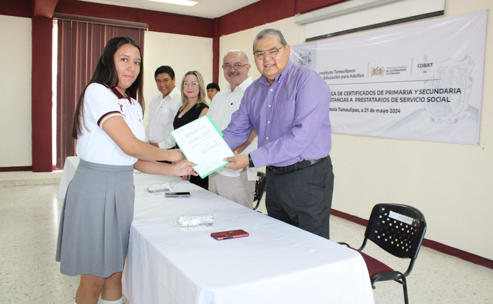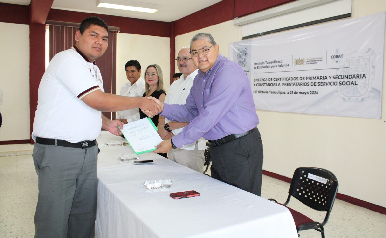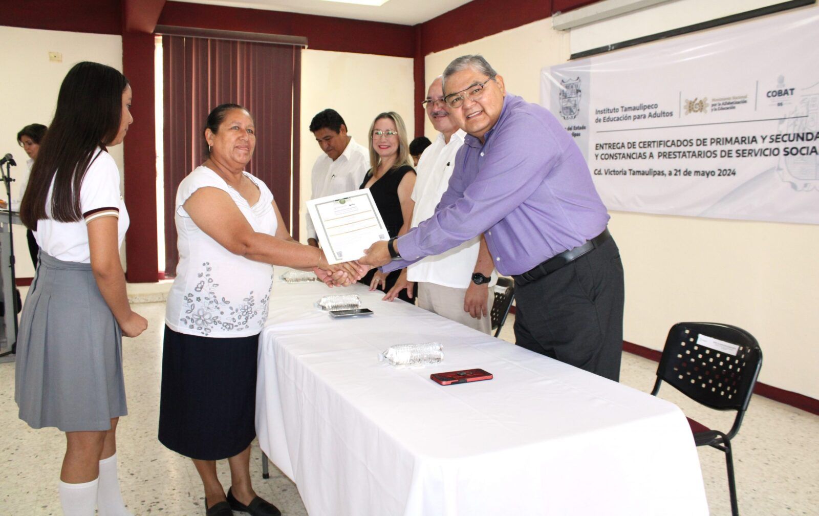 Ciudad Victoria, Tam. – En el marco del Movimiento Nacional por la Alfabetización y la Educación (MONAE), este 14 de junio de 2024, el Instituto Tamaulipeco de Educación para Adultos hizo entrega seis certificados de Primaria y doce certificados de Secundaria; así como quince constancias a prestatarios de servicio social, estudiantes participantes de la Preparatoria Federalizada número 2 “Lic. Aniceto Villanueva Martínez” de Ciudad Victoria.