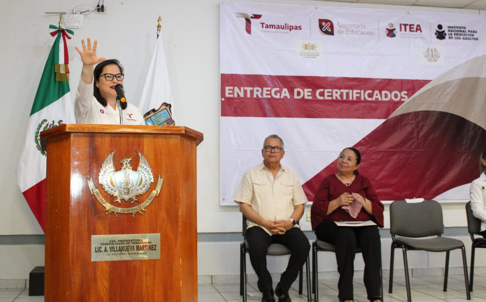 La directora del Instituto Tamaulipeco de Educación para Adultos, Gloria Guadalupe González González, agradeció el apoyo y las facilidades que se le brindaron por parte del plantel al hacer posible esta entrega de certificados y mencionó: “Nos sentimos muy felices y nos llena de satisfacción poder realizar esta emotiva ceremonia para nuestros educandos y educandas, agradezco a la Secretaria de Educación por todo el apoyo que nos ha brindado al Instituto desde el día uno del gobierno del Doctor Américo Villarreal, y nuestro trabajo es lograr la certificación de educación básica de nuestros jóvenes y adultos que por razones diversas se encuentran en rezago educativo, hoy estamos de fiesta al ver la culminación de grandes sueños ya que personas como ustedes lo han mencionado, si se puede y a la gran labor de los alumnos de esta Preparatoria sumándose al MONAE, preocupados por nuestra comunidad y se dieron a la tarea de apoyar a las personas”.