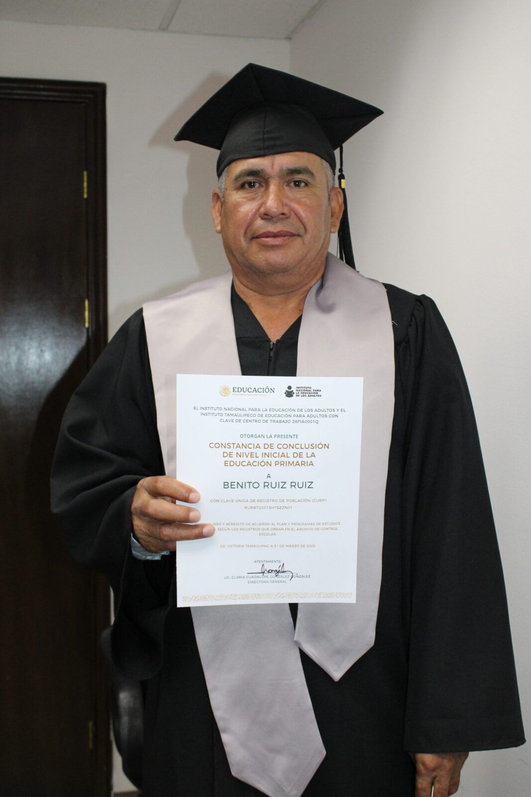 Cidudad, Victoria, Tamaulipas. – Este 31 de marzo, en las instalaciones de la Secretaría de Educación, el educando Benito Ruiz Ruiz, recibe con orgullo de manos de la secretaria de Educación de Tamaulipas, Lucía Aimé Castillo Pastor, constancia de alfabetización, que comprueba que ha aprendido a leer y escribir en el ITEA con calificación excelente, en un proceso educativo de cuatro meses; lo que ha permitido que continúe con su proceso de aprendizaje de educación primaria.